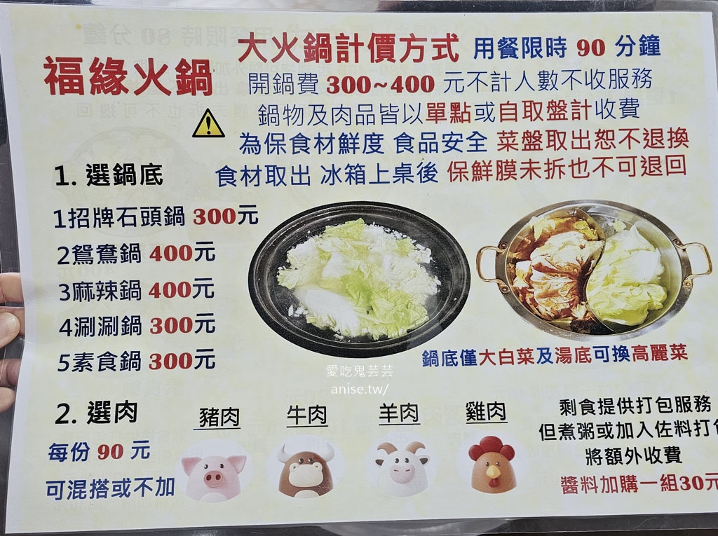火鍋菜單如下